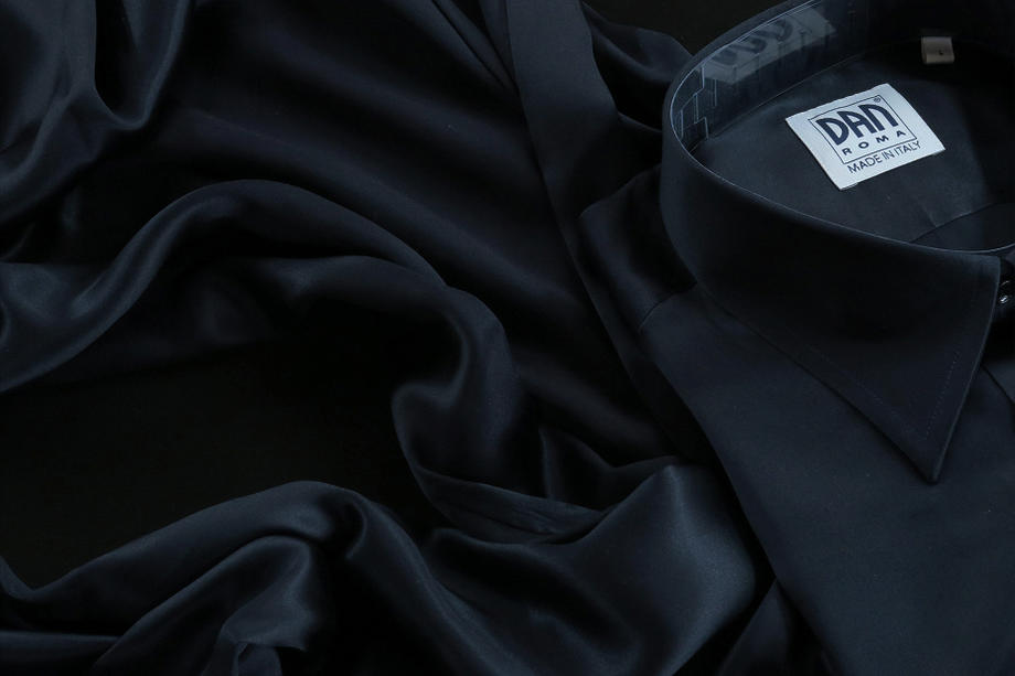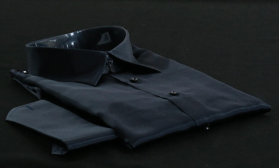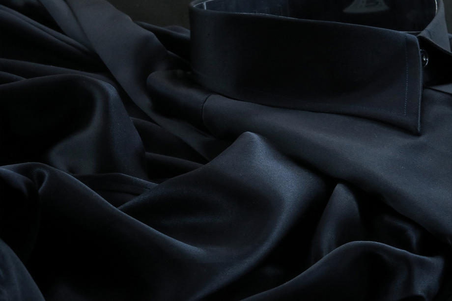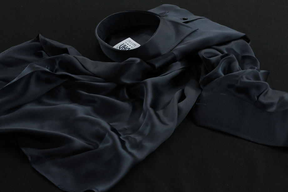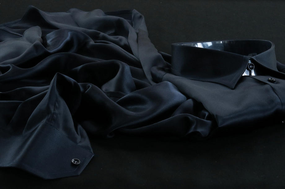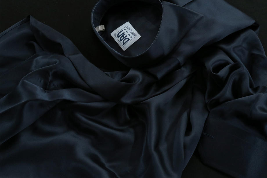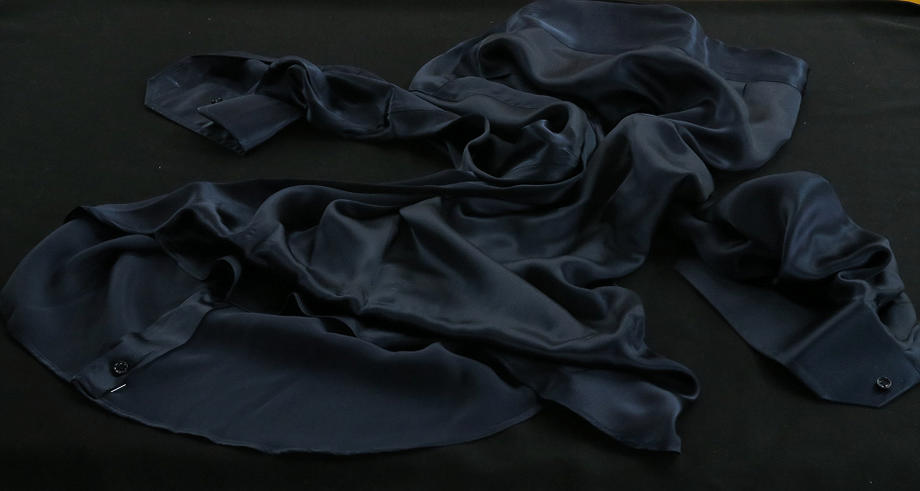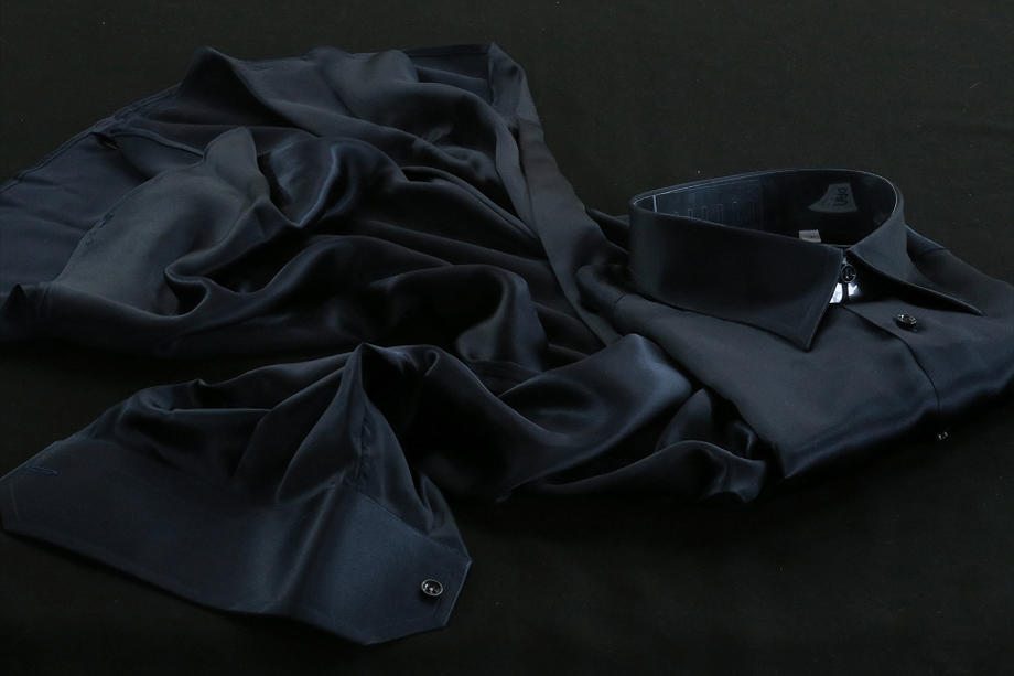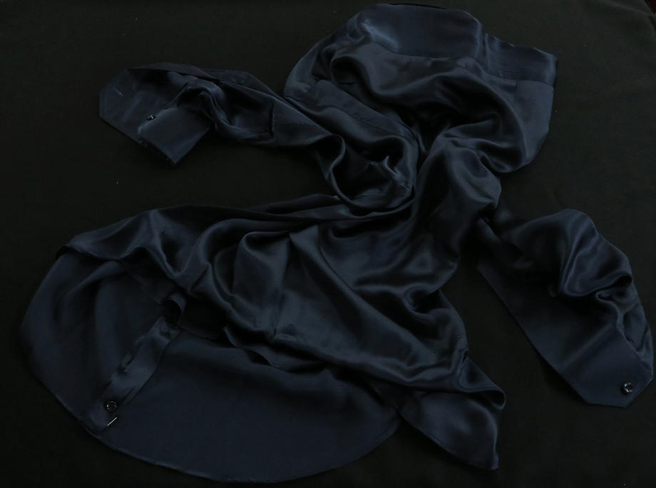 ★以前からずっと取り寄せようと思っていました。シルクサテンシャツ真珠色のダークネイビーブルーです